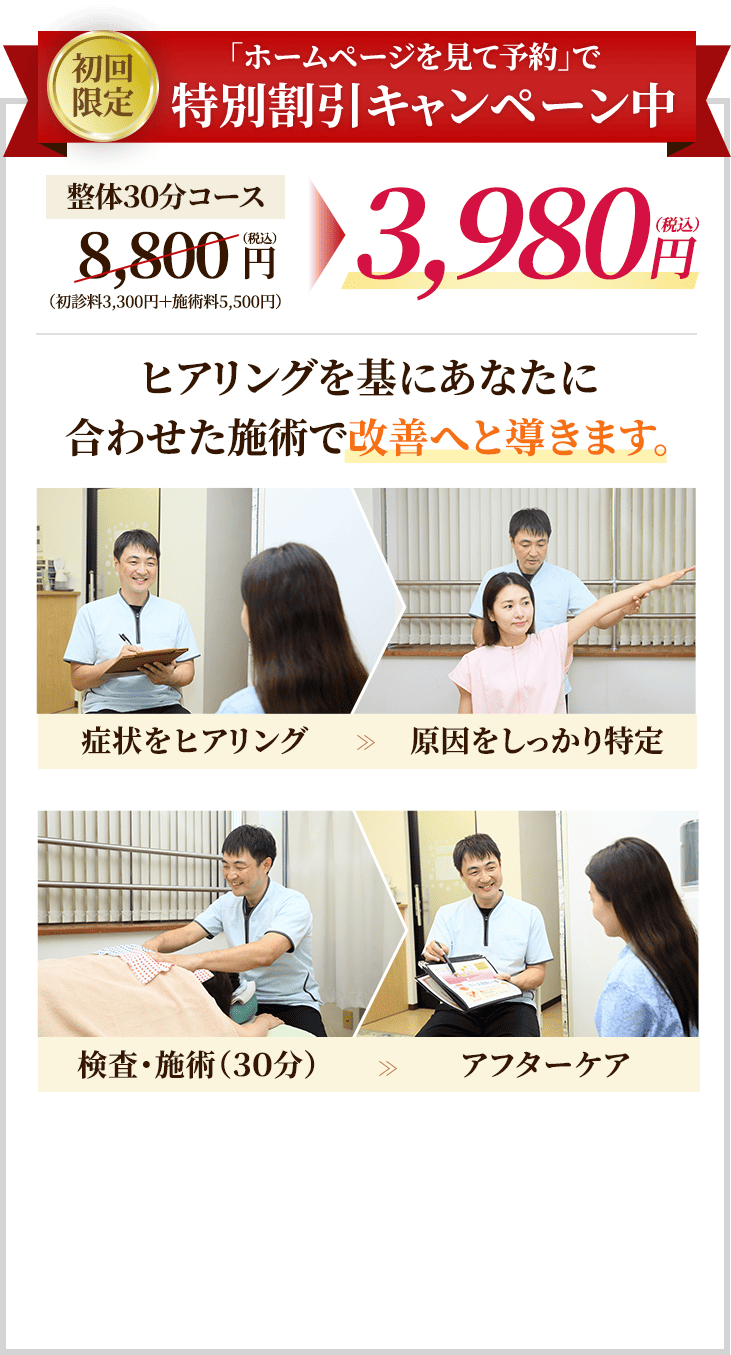 | 初めての方 (整体30分コース) | 8,800円 3,300円(初検料)+5,500円(施術料) →割引適用で3,980円 |